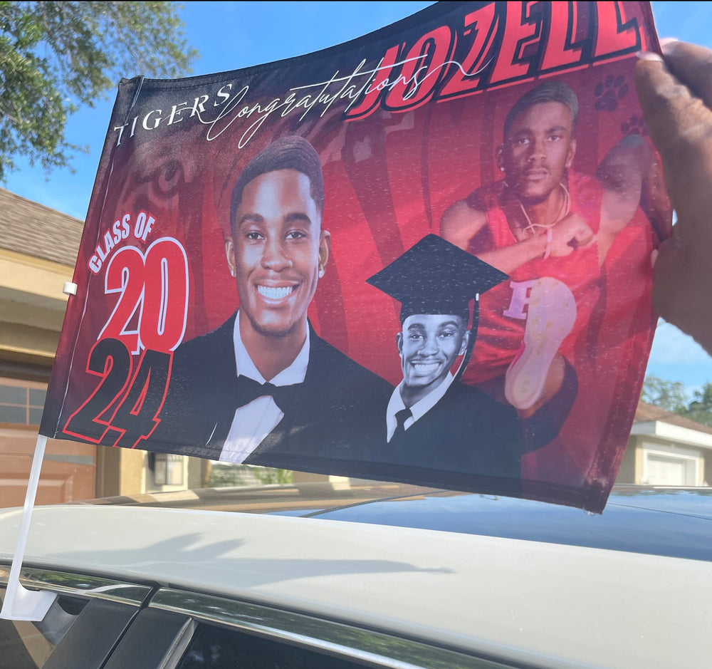 Boost your graduate's pride with our custom Grad Car Flag. Made with sublimation technology, this flag showcases their achievement with vibrant colors and crisp graphics. Perfect for displaying on their car, it's sure to catch the eye of anyone passing by. Celebrate their success in style!