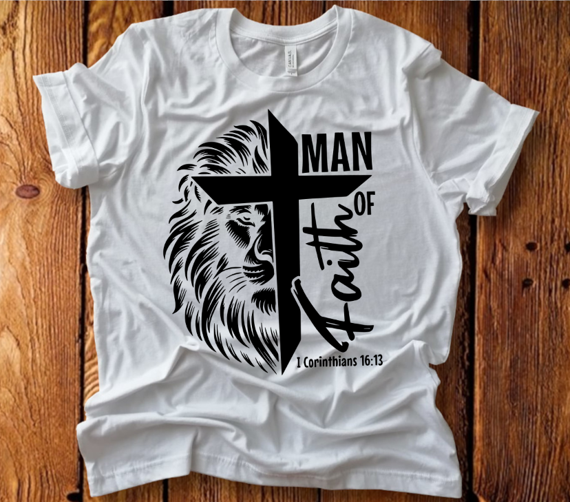 The Man of Faith Graphic T-Shirt is a stylish and meaningful addition to your wardrobe. Featuring a stunning design, this shirt represents your Christian faith and showcases your devotion to God. Wear it proudly and confidently as it's pressed with premium vinyl with a professional quality heat press.